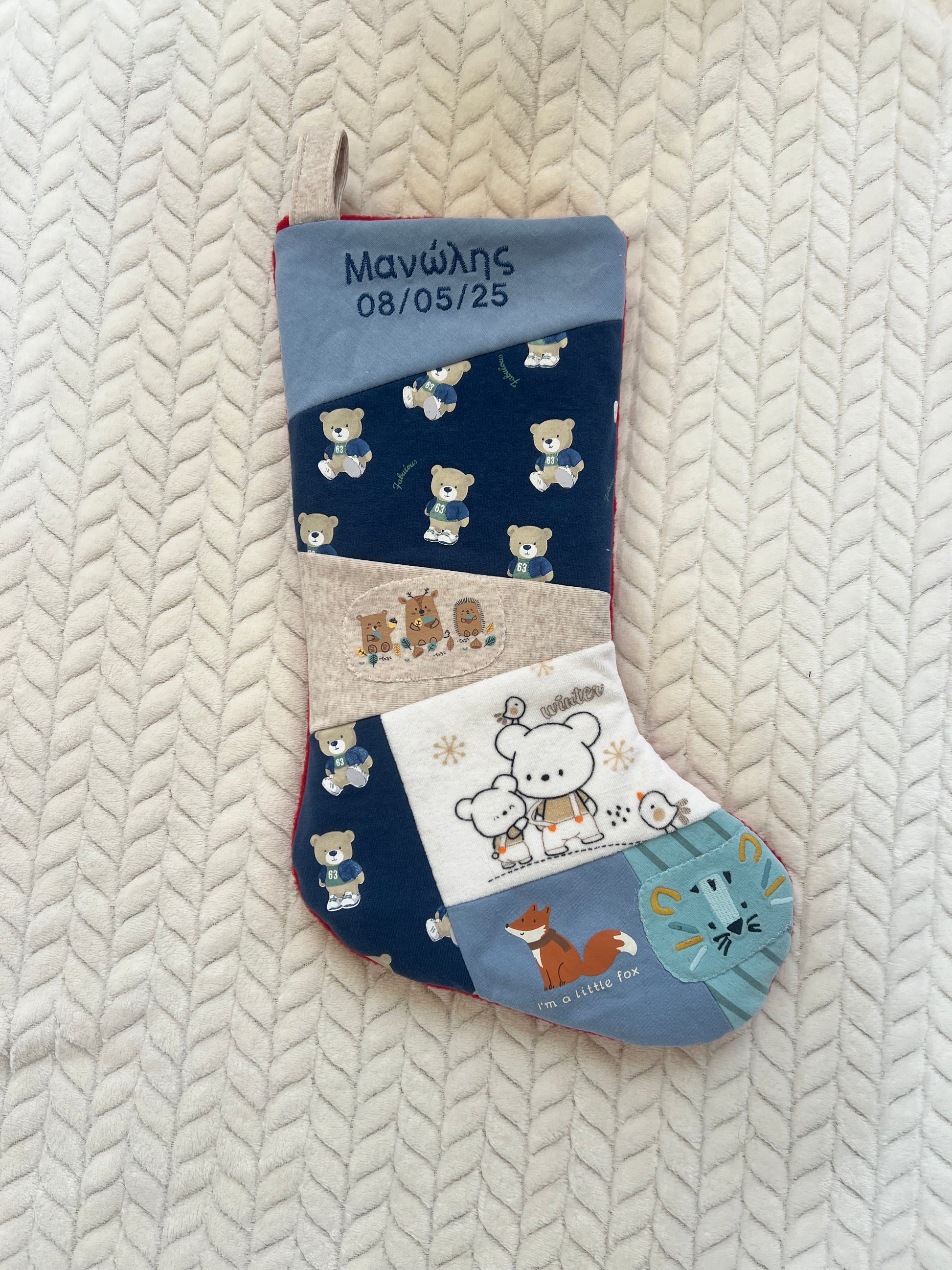Αυτή η χριστουγεννιάτικη κάλτσα είναι φτιαγμένη από τα αγαπημένα βρεφικά ρουχαλάκια του παιδιού σου — εκείνα που δεν μπορείς να αποχωριστείς, γιατί κρύβουν μέσα τους μια ολόκληρη εποχή: τις πρώτες αγκαλιές, τα πρώτα γέλια, τις πιο όμορφες στιγμές σας!